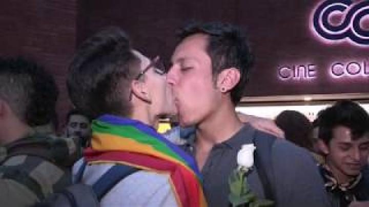 Entre la multitud reunida fuera del establecimiento, ubicado en uno de los barrios más acomodados del norte de la capital colombiana, se alzaron coloridas banderas multicolor que representan a lesbianas, gais, bisexuales, transgéneros e intersexuales (LGTBI) y pancartas con mensajes como "los besos son afecto, no delito".